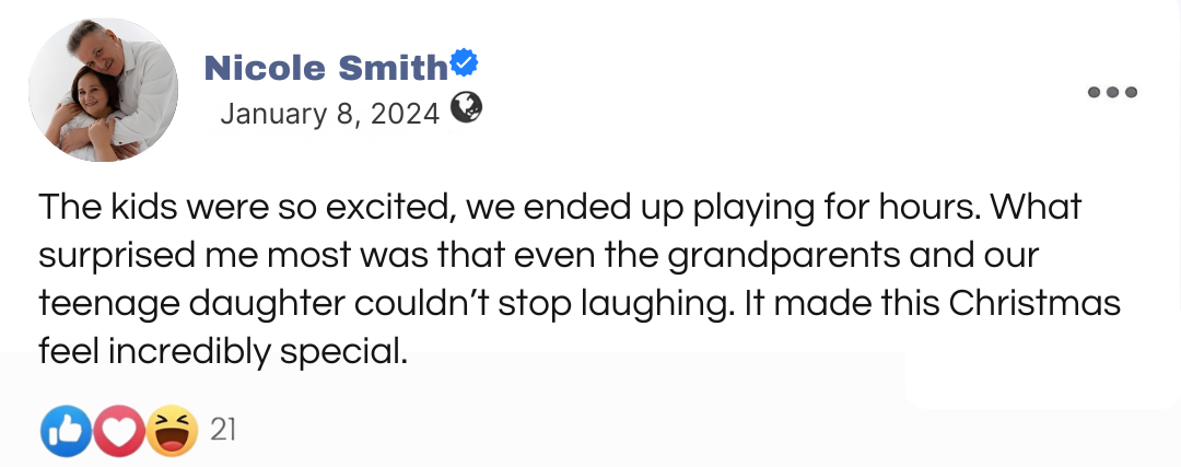 This game creates the kind of moments families rarely get anymore. It brings everyone together in a way that feels natural, effortless, and genuinely fun — no phones, no distractions. Parents, kids, and even grandparents join in, competing, interacting, and sharing a moment that feels real. The friendly challenges and teamwork naturally build a deeper family connection in a way digital toys never could.